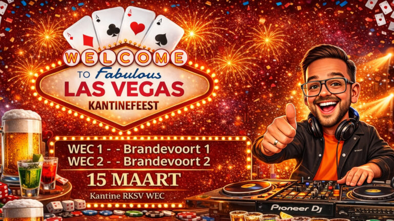Op 15 MAART toveren we de kantine van RKSV WEC om tot het meest legendarische casino van de regio. Eerst knallen WEC 1 & 2 beide tegen Brandevoort, daarna gaat het dak eraf tijdens ons kantinefeest. DJ Thomas Koolen pompt de lekkerste platen door de speakers, de shotjes vliegen over de bar, het bier staat ijskoud klaar en jij kunt je geluk testen met minigames in de kantine om 17.15. Het radje draait op volle toeren achter de bar!